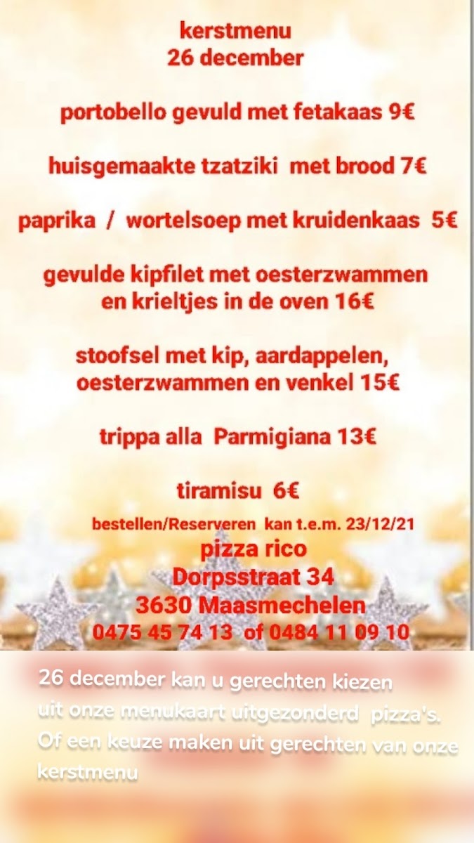 Welcome to Pizza Rico, located at Dorpsstraat 34 in the charming village of Maasmechelen, Belgium. This delightful eatery invites you to indulge in authentic Italian cuisine, highlighted by their freshly made pizzas and delectable pasta dishes. The warm and friendly ambiance, coupled with attentive service, has earned glowing reviews from satisfied customers.